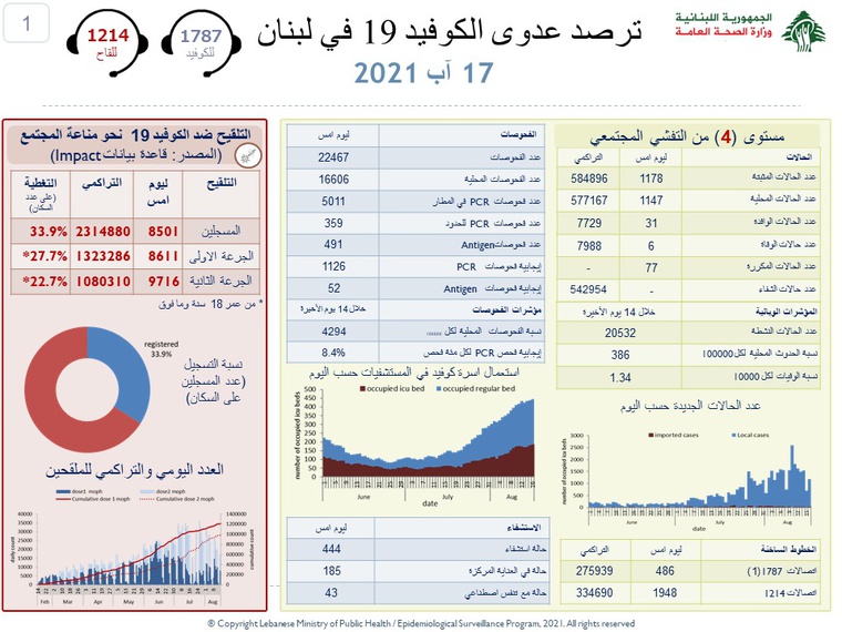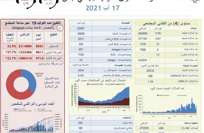 محليات وزارة الصحة: 1178 إصابة جديدة بكورونا و6 حالات وفاة By F.S أغسطس 17, 2021 لا توجد تعليقات وزارة الصحة