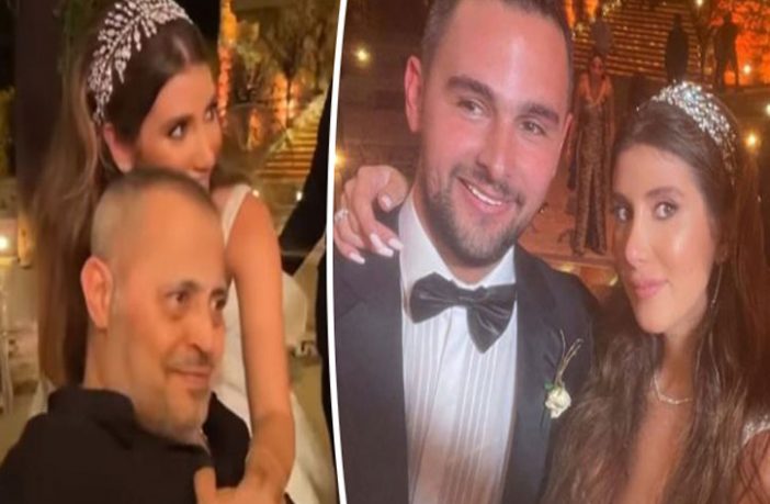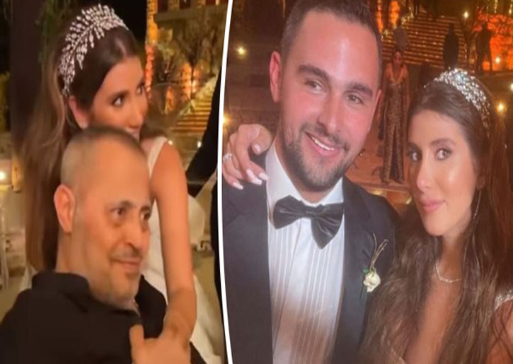 وظهرت العروس في أحد المقاطع بفستانها المميّز وهي تقترب من النجم السوري وتمسك بيده وترقص معه وتغمره بلطف ليبادلها الاحتضان بحب وحنية، وراحت ترقص خلفه بطريقة عفوية وتنقل له الأجواء اليه احتراما لحالته الصحية التي تمنعه من التحرك على راحته.