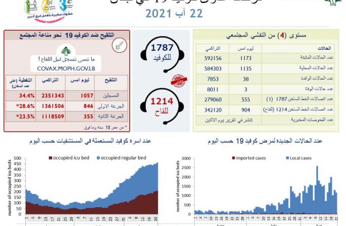 محليات وزارة الصحة اللبنانية: 1173 إصابة جديدة بفيروس كورونا و 3 حالات وفاة By F.S أغسطس 22, 2021 لا توجد تعليقات وزارة الصحة
