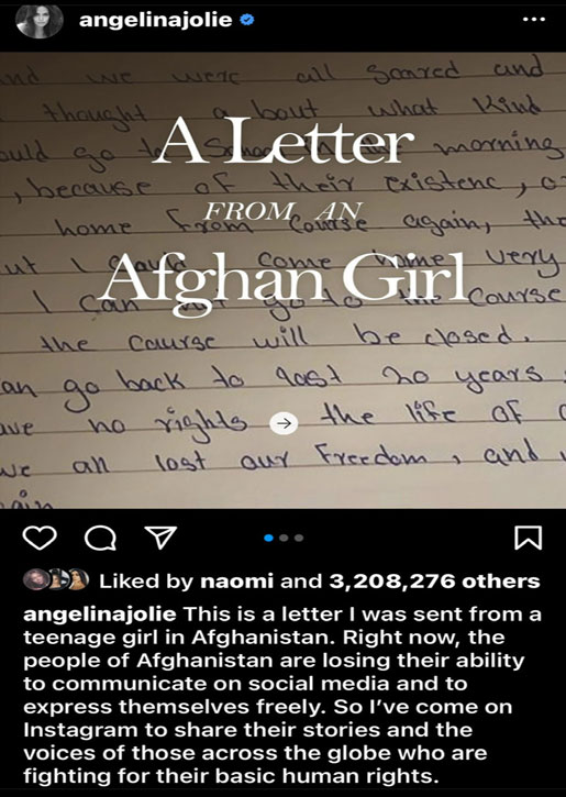 وشاركت أنجلينا جمهورها بمنشورها الأول وهي رسالة مكتوبة بخط اليد تلقتها من فتاة أفغانية بعد تولي حركة طالبان السلطة.