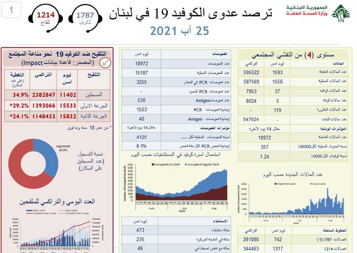 أعلنت وزارة الصحة العامة في تقريرها اليومي تسجيل 1593 إصابة جديدة بفيروس كورونا رفعت العدد التراكمي للحالات المثبتة الى 595522، كما تم تسجيل 5 حالات وفاة.
