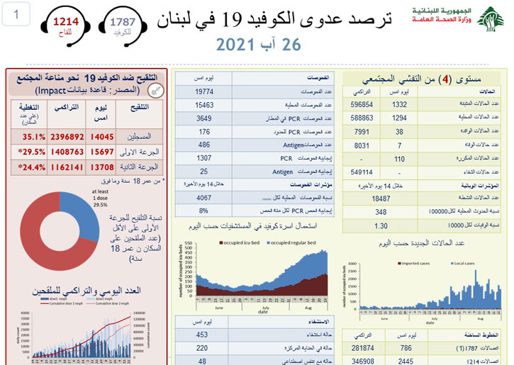 أعلنت وزارة الصحة العامة في تقريرها اليومي تسجيل 1332 إصابة جديدة بفيروس كورونا رفعت العدد التراكمي للحالات المثبتة الى 596854 ، كما تم تسجيل 7 حالات وفاة.