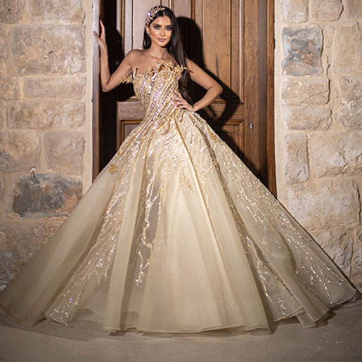 وقد أطلت عروسته جيوفاني خوام بإطلالتين ساحرتين من توقيعه، الفستان الأول مرصع بحبات الشواروفسكي اللامعة تميز بطوله حيث امتد حوالي 6 أمتار، الأمر الذي زاد الإطلالة تألقاً وجمال وملوكية. واللافت كانت الطرحة التي ارتدتها العروس والمصنوعة من خيوط القصب الذهبي والكريستال.