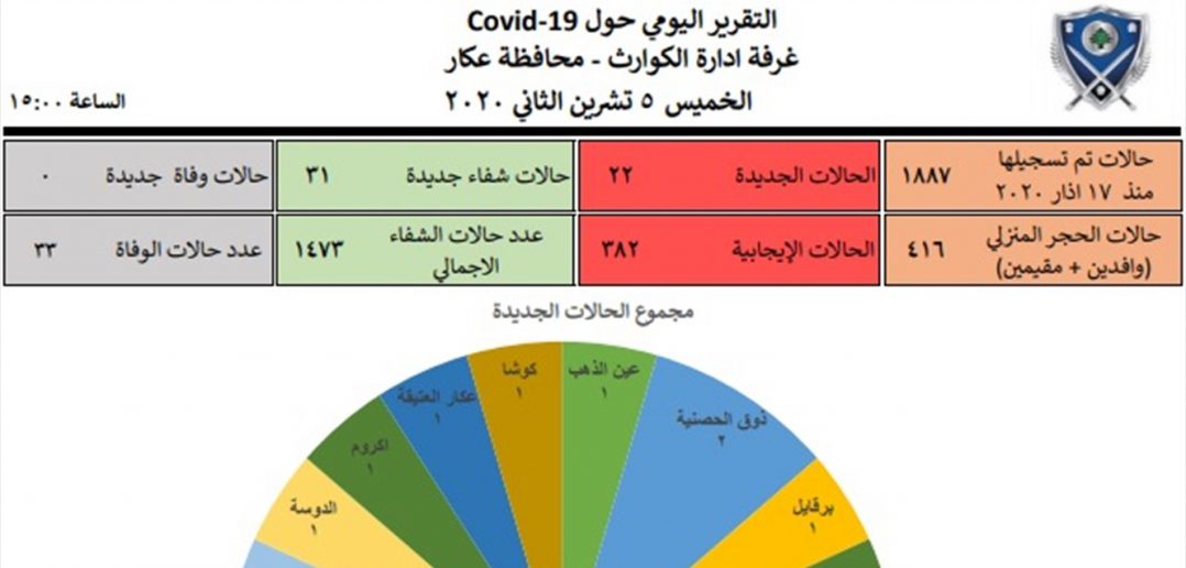 سجل التقرير اليومي لغرفة إدارة الكوارث في عكار 22 حالة إيجابية جديدة موزعة على البلدات العكارية على الشكل الآتي: