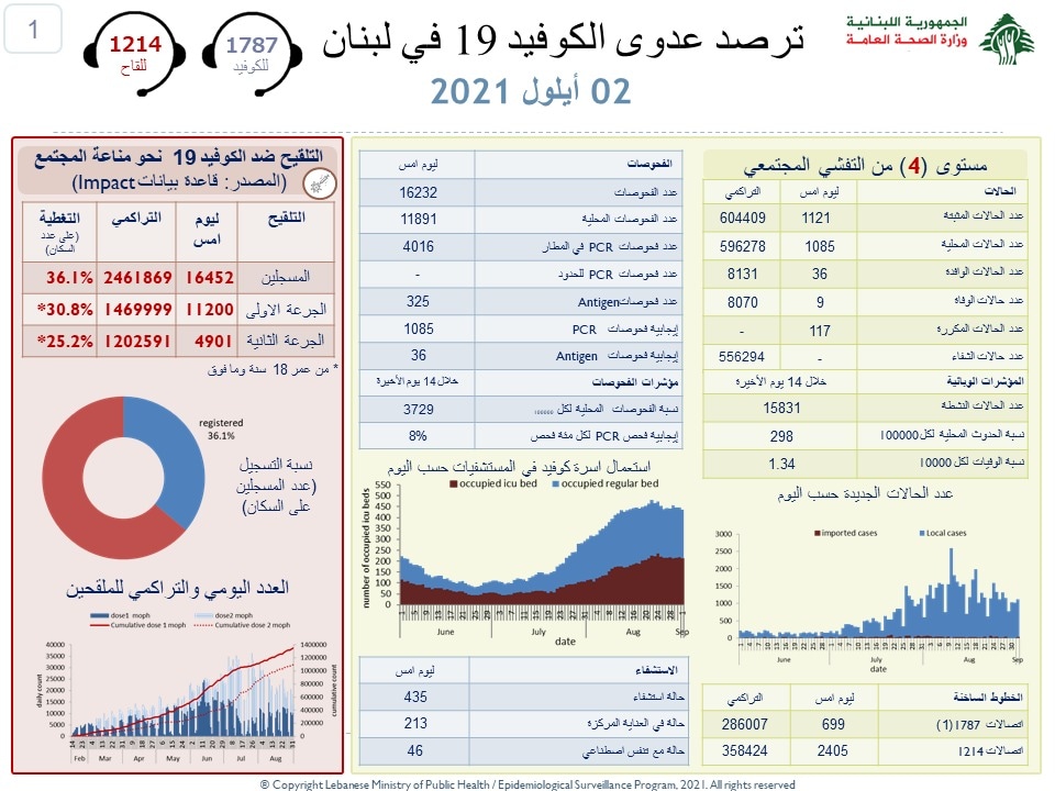 جائحة كورونا كورونا لبنان: تسجيل 1121 إصابة جديدة و 9 حالات وفاة By F.S سبتمبر 2, 2021 لا توجد تعليقات كورونا لبنان