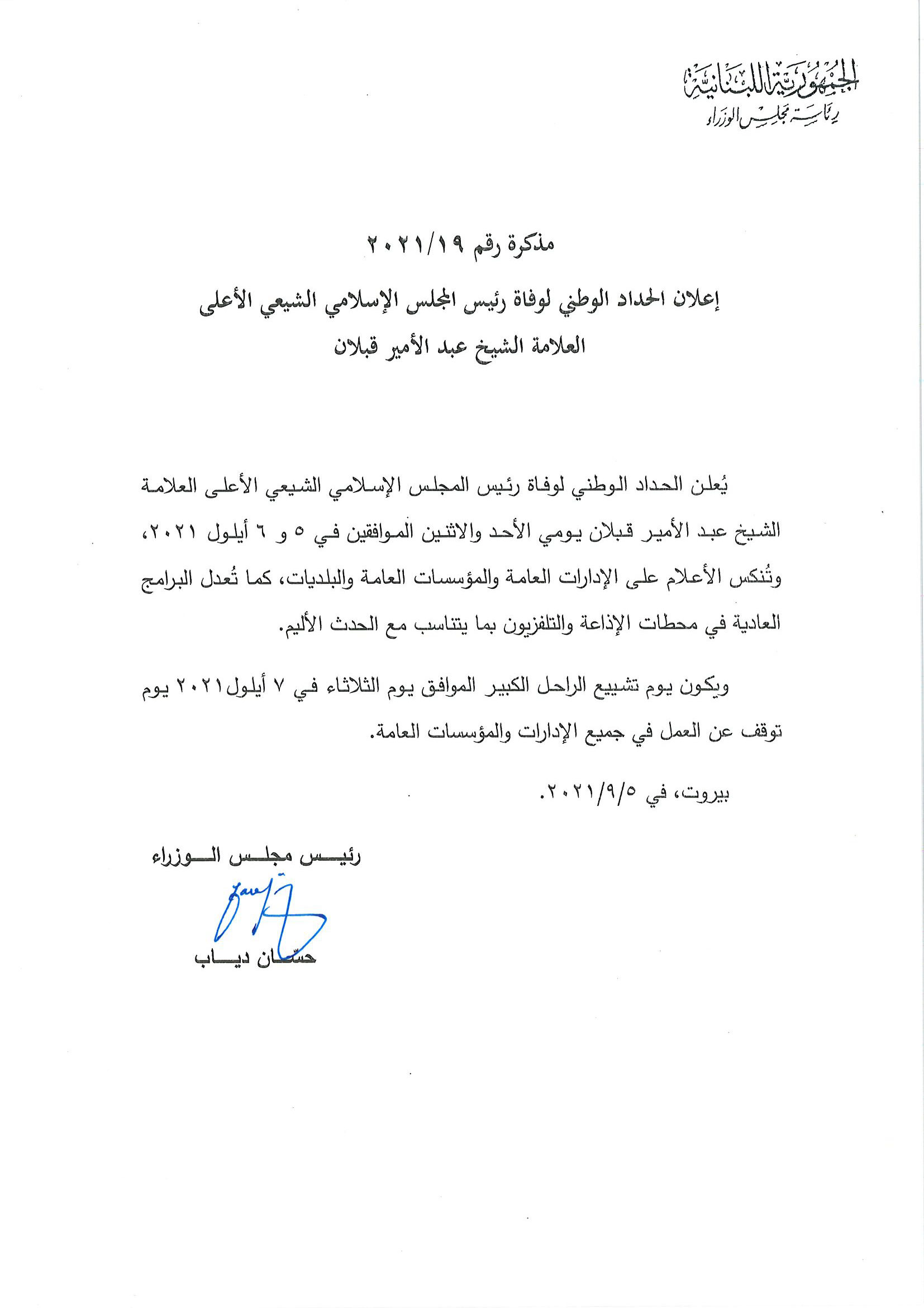 اعلن رئيس حكومة تصريف الاعمال حسان دياب في مذكرة، الحداد الوطني لوفاة رئيس المجلس الاسلامي الشيعي الاعلى العلامة الشيخ عبد الامير قبلان يومي الاحد والاثنين، وتنكس الاعلام على الادارات والمؤسسات العامة والبلديات، كما تعدل البرامج العادية في محطات الاذاعة والتلفزيون بما يتناسب مع الحدث الاليم.