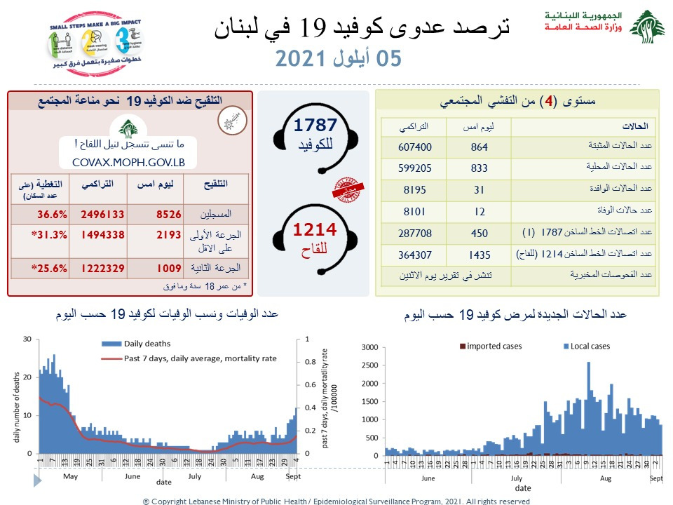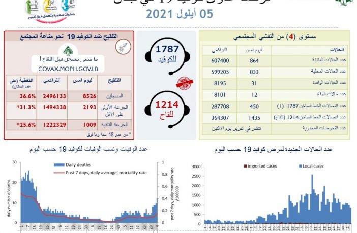 محليات وزارة الصحة اللبنانية: 864 إصابة جديدة بفيروس كورونا و 12 حالة وفاة By F.S سبتمبر 5, 2021 لا توجد تعليقات وزارة الصحة اللبنانية: 864 إصابة جديدة بفيروس كورونا و 12 حالة وفاة وزارة الصحة اللبنانية