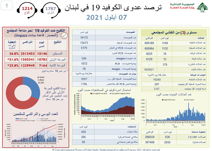 أعلنت وزارة الصحة العامة في تقريرها اليومي تسجيل 1148 إصابة جديدة بفيروس كورونا رفعت العدد التراكمي للحالات المثبتة الى 609189 ، كما تم تسجيل 15 حالة وفاة.