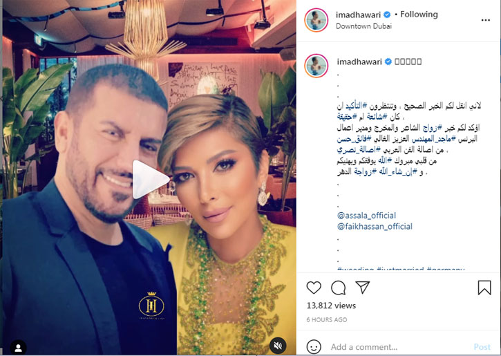 الاعلامي عماد هواري أكد زواج اصالة نصري بفائق حسن وبارك لهما.