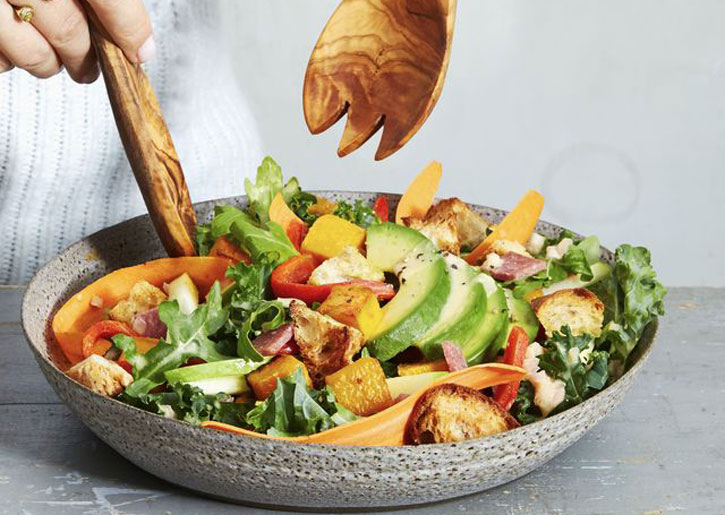 الغداء. طبق من السلطة مع سلطة خفيفة مع الافوكادو والفطر، قطعة متوسطة الحجم من اللحم المشوي من دون دهون.