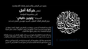 تدعوكم حركة أمل في إقليم جبل عامل الى أوسع مشاركة في وداع الصابرة المجاهدة المرحومة السيدة بروين خليلي زوجة الإمام الصدر (أعاده الله)، لنكون في غربته حاضرين مندفعين لتأدية الواجب على أكمل وجه.