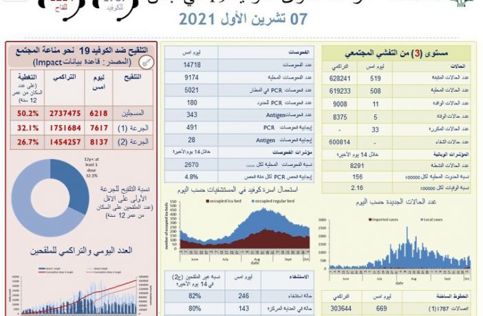 أعلنت وزارة الصحة العامة في تقريرها اليومي تسجيل 519 إصابة جديدة بفيروس كورونا رفعت العدد التراكمي للحالات المثبتة الى 628241 ،كما تم تسجيل 5 حالات وفاة.