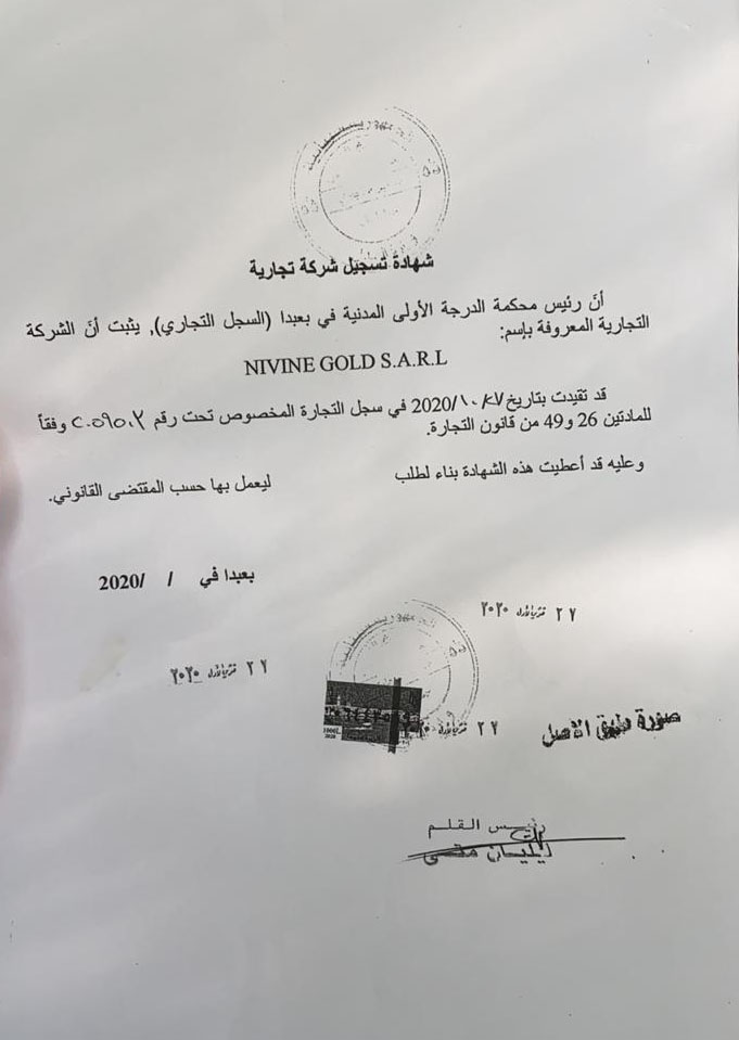 بعد أن نال منتج لبان الذكر الذهبي By Nivine رواجاً لدى الناس في مختلف المناطق اللبنانية ووصل الى دول العالم وخاصة الى افريقيا حيث ظهرت نتائجه الإيجابية وبدأ الإقبال يتزايد عليه يوماً بعد يوم، أعلنت السيدة نيفين عن تسجيل المنتج في السجل التجاري بإسم Nivine Gold S.A.R.L ونيله الصفة الرسمية كمنتج طبيعي 100% ولا يدخل تركيبته أي مواد كيميائية..