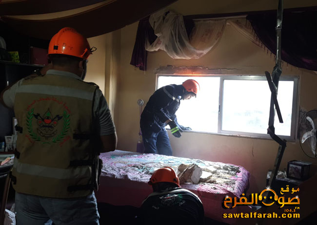 وقد أرسلت وحدة ادارة الكوارث في اتحاد بلديات قضاء صور مهندساً للكشف وتقييم الاضرار وتبيان الاسباب فيما تدخلت على الفور فرق المستجيب الاول التابعة للوحدة ولجمعية الرسالة لإجلاء السكان وتقييم الاضرار وتدعيم المبنى.