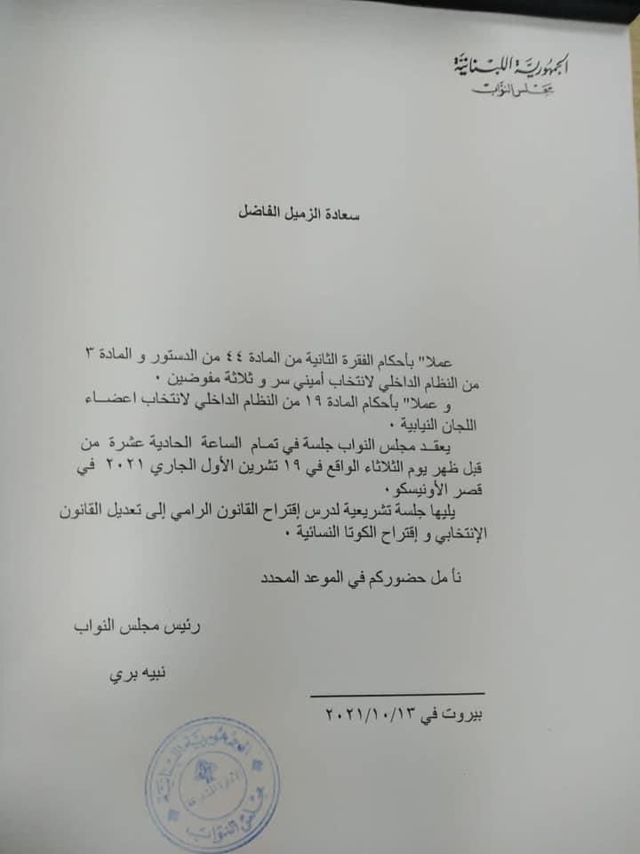 دعا رئيس مجلس النواب نبيه بري الى جلسة عامة لمجلس النواب عند الحادية عشرة من قبل ظهر يوم الثلاثاء في 19 الحالي، في قصر الأونيسكو، لإنتخاب أميني سر وثلاثة مفوضين، وذلك عملا بأحكام الفقرة الثانية من المادة 44 من الدستور والمادة 3 من النظام الداخلي لمجلس النواب، يليها جلسة تشريعية لدرس القانون الرامي الى تعديل قانون الإنتخابات النيابية وإقتراح الكوتا النسائية.