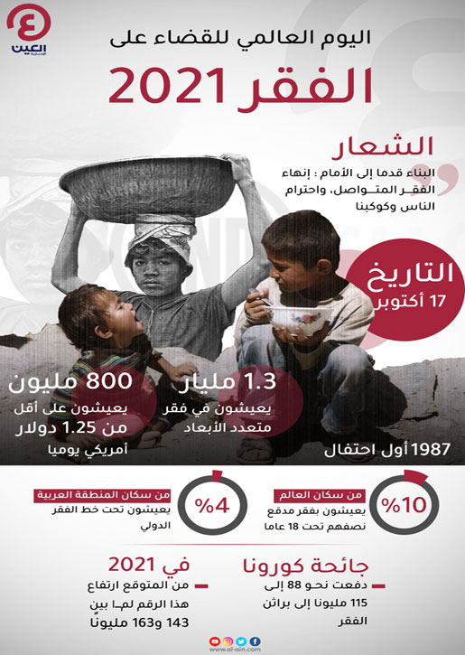 الإنفوجراف التالي يرصد أبرز المعلومات عن اليوم العالمي للقضاء على الفقر 2021.