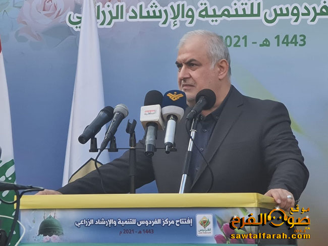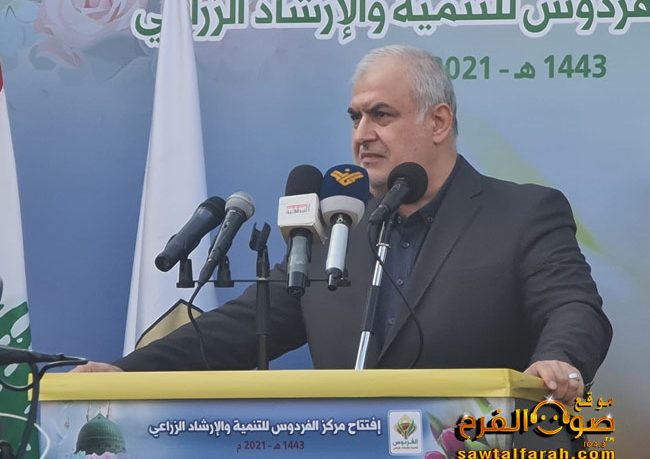 كلام رعد جاء خلال رعايته حفل إطلاق مركز الفردوس للتنمية والإرشاد الزراعي بمناسبة المولد النبوي في بلدة تول الجنوبية ،الحفل حضره النائب ياسين جابر ، مسؤول منطقة الجنوب الثانية في حزب الله علي ضعون ،مدير عام مؤسسة جهاد البناء محمد خنسا ، محافظ النبطية ممثلا بالاستاذ صادق اسماعيل، رئيسة دائرة التعاونيات الزراعية في محافظة النبطية هدى عباس ، فعاليات بلدية ، رؤساء تعاونيات زراعية ، علماء دين ، ومهندسون زراعيون .. وفي ختام الحفل توجه الحضور لزرع شجريتين باسم زيتونة المولد النبوي وزيتونة شهداء الطيونة ..