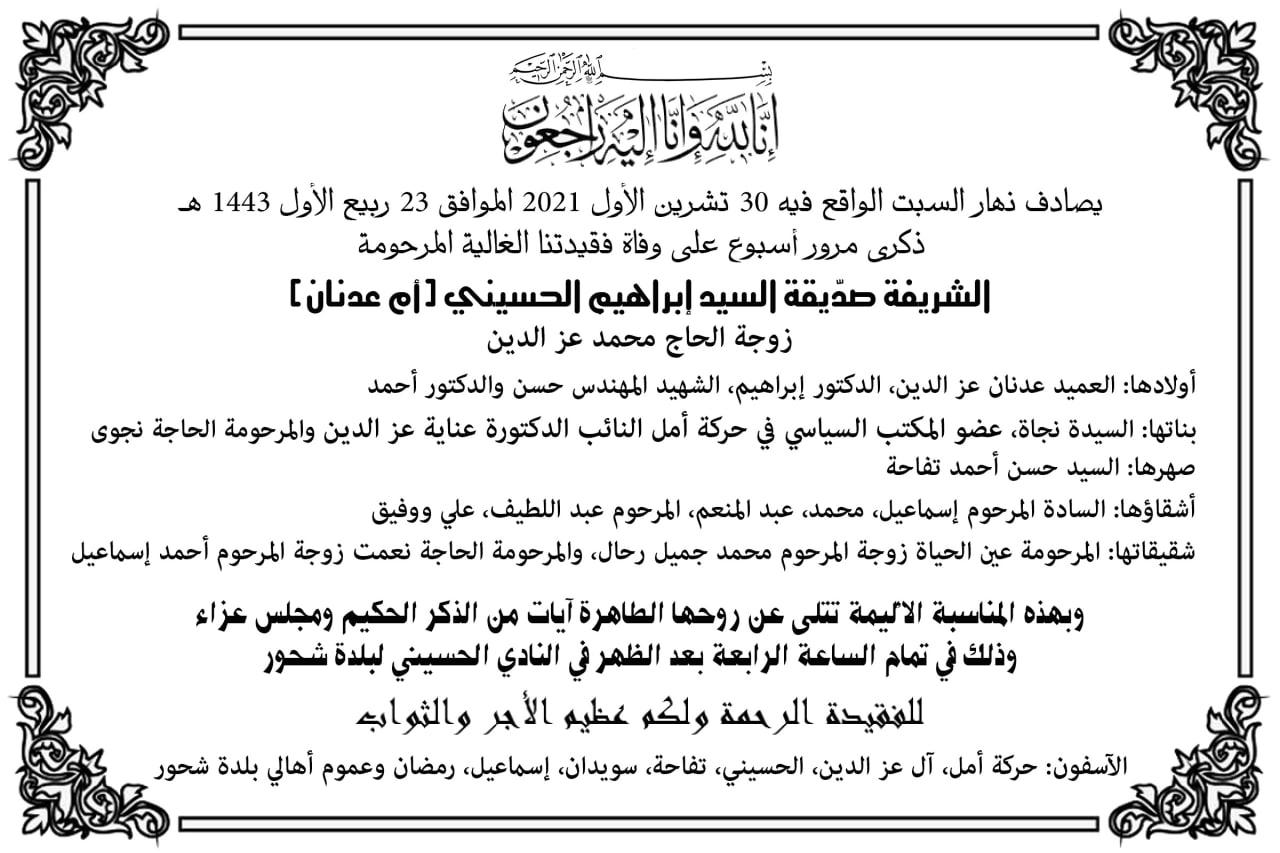 وفيات دعوة لإحياء اسبوع والدة النائب الدكتورة عناية عز الدين في شحور By F.S أكتوبر 26, 2021 لا توجد تعليقات شحور