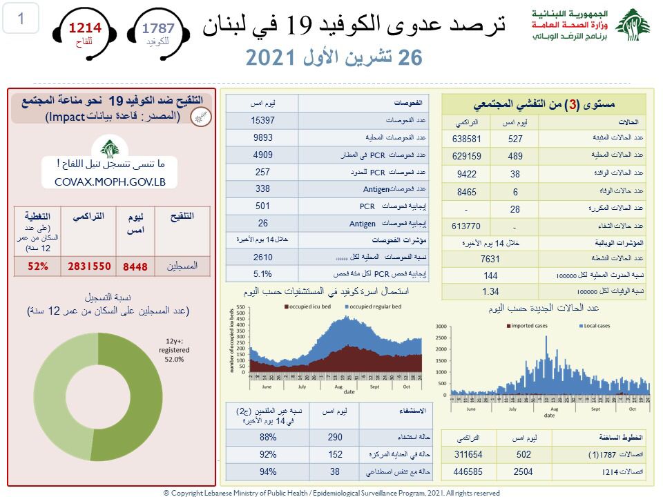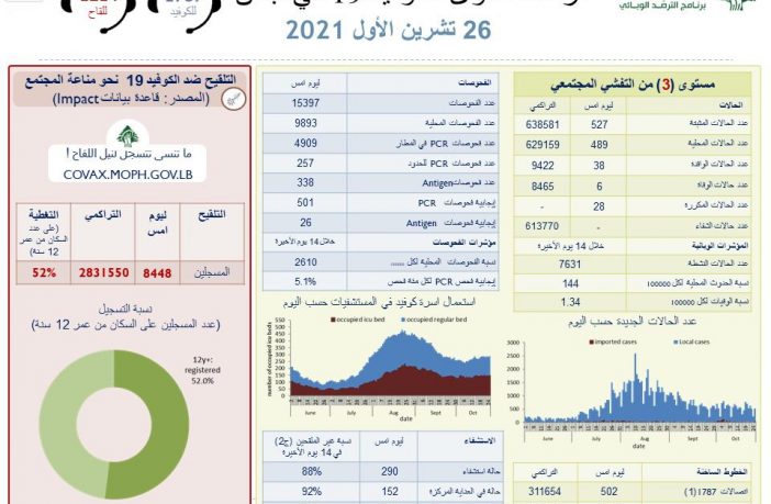 جائحة كورونا وزارة الصحة: تسجيل 527 إصابة جديدة فيروس كورونا و6 حالات وفاة By F.S أكتوبر 26, 2021 لا توجد تعليقات وزارة الصحة: تسجيل 527 إصابة جديدة فيروس كورونا و6 حالات وفاة وزارة الصحة