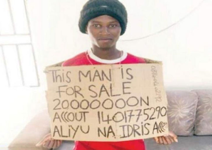 واعتقل أليو إدريس البالغ 26 عاماً، أول من أمس الثلاثاء من قبل شرطة «الحسبة» المكلفة بتطبيق الشريعة الإسلامية في كانو بعد انتشار صور له على وسائل التواصل الاجتماعي تظهره حاملاً لافتة كتب عليها أنه يعرض نفسه للبيع في مزاد علني يبدأ من 20 مليون نايرا (49 ألف دولار)، وفقاً لوكالة الصحافة الفرنسية.