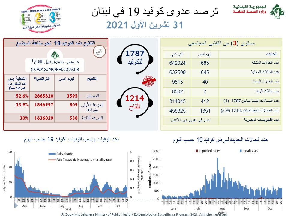 جائحة كورونا وزارة الصحة: تسجيل 685 إصابة جديدة بفيروس كورونا و 7 حالات وفاة By F.S أكتوبر 31, 2021 لا توجد تعليقات وزارة الصحة: تسجيل 685 إصابة جديدة بفيروس كورونا و 7 حالات وفاة اخبار لبنان