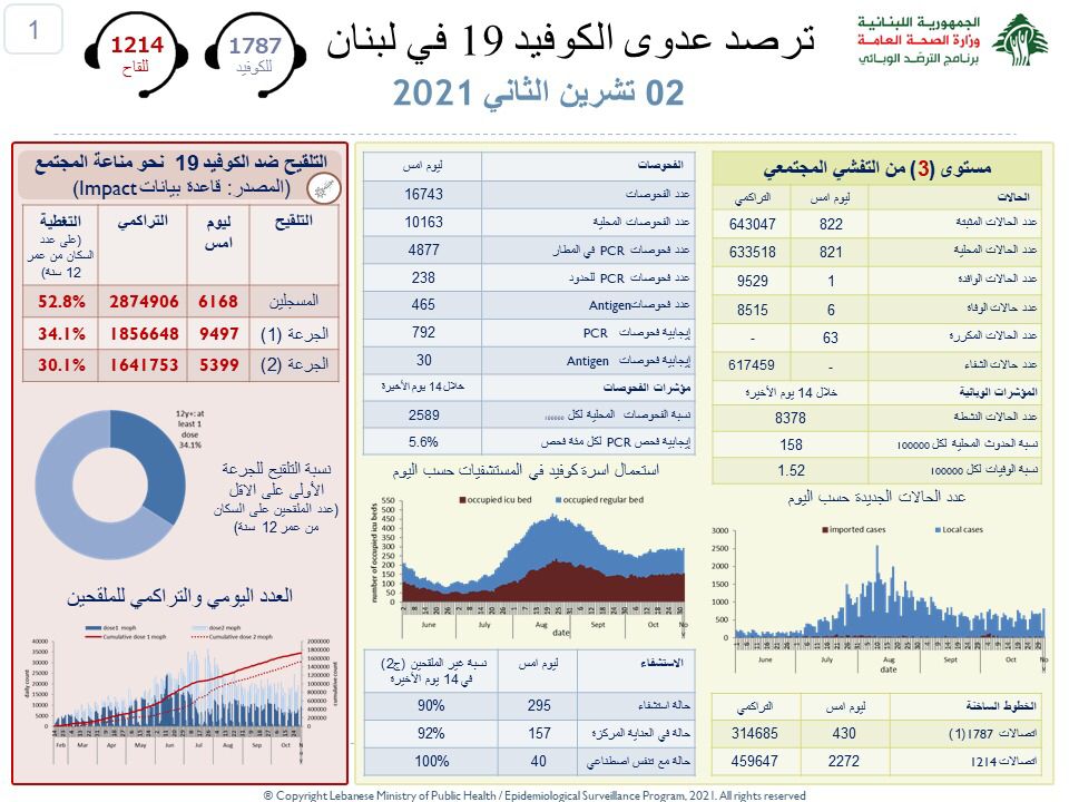 جائحة كورونا وزارة الصحة: تسجيل 822 إصابة جديدة بفيروس كورونا و 6 حالات وفاة By F.S نوفمبر 2, 2021 لا توجد تعليقات وزارة الصحة: تسجيل 822 إصابة جديدة بفيروس كورونا و 6 حالات وفاة لبنان كورونا