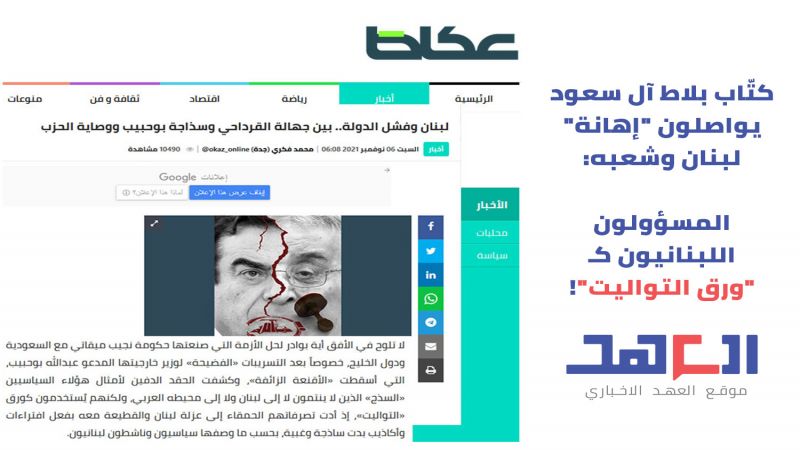 يواصل الاعلام السعودي هجمته على لبنان، واهاناته المتكررة اليومية لمسؤوليه وكرامته الوطنية. آخر فصول هذه التعديات كان ما كتبته صحيفة “عكاظ” صبيحة السبت 6 تشرين الثاني، حيث شبّهت المسؤولين اللبنانيين بـ”ورق التواليت”:
