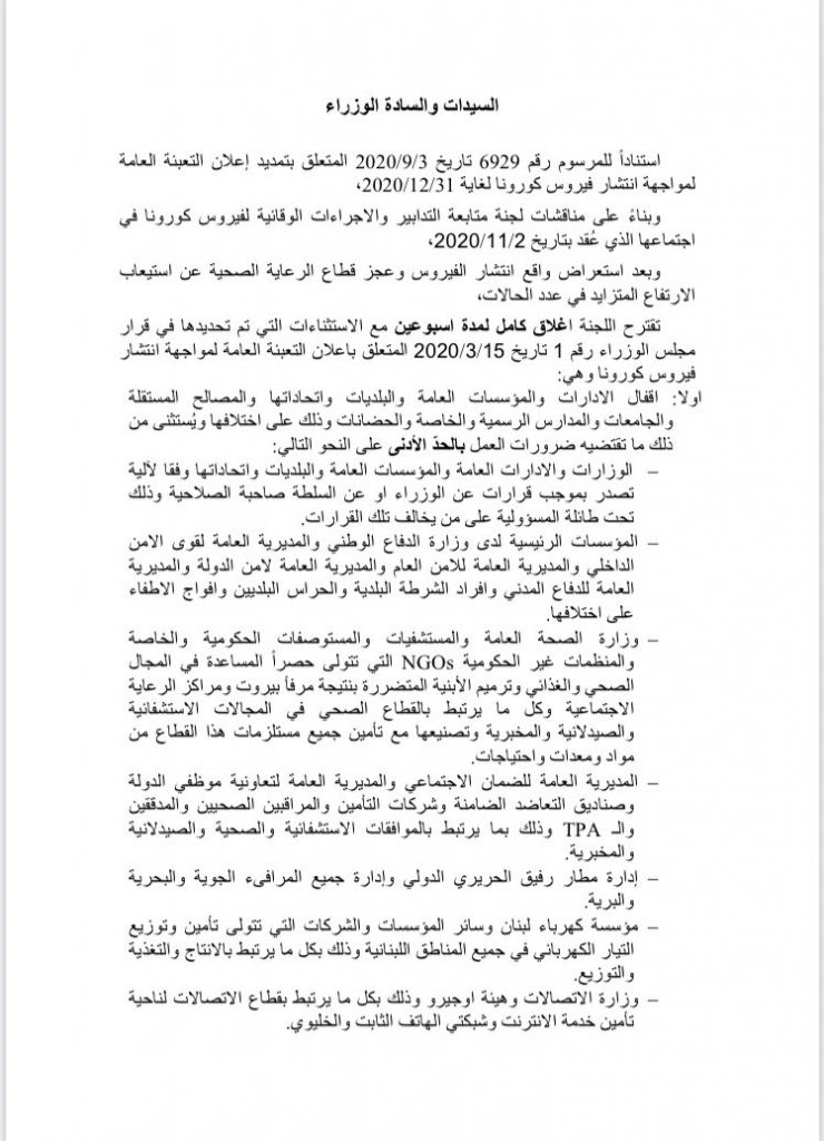 اقترحت لجنة كورونا إغلاقاً عاماً لمدة أسبوعين مع الإستثناءات التي تمّ تحديدها وهي: