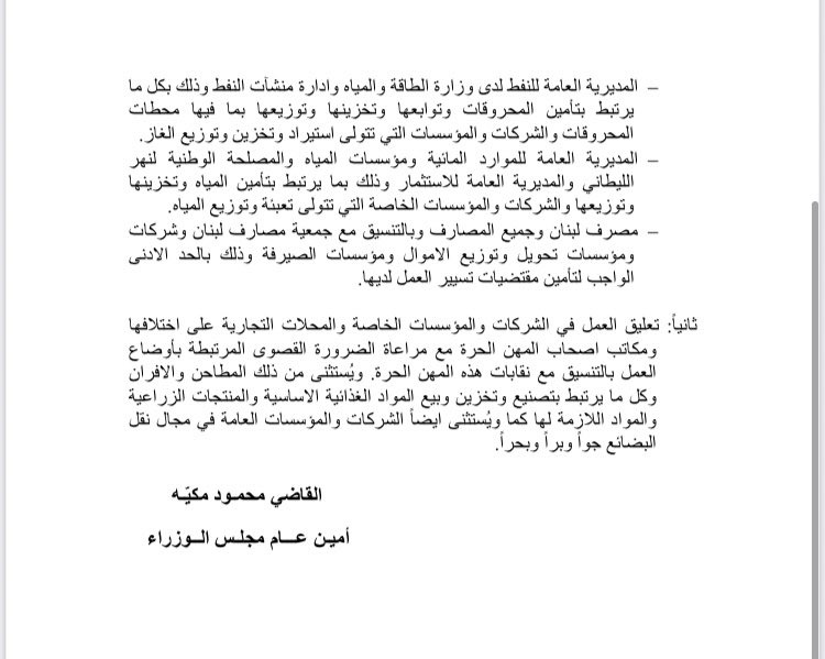 – مصرف لبنان وجمیع المصارف وبالتنسیق مع جمعیة مصارف لبنان وشركات ومؤسسات تحویل وتوزیع الاموال ومؤسسات الصیرفة وذلك بالحد الادنى الواجب لتأمین مقتضیات تسییر العمل لدیھا.