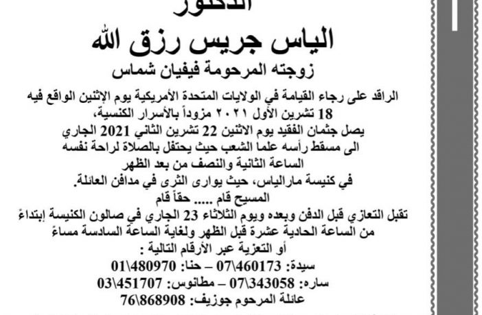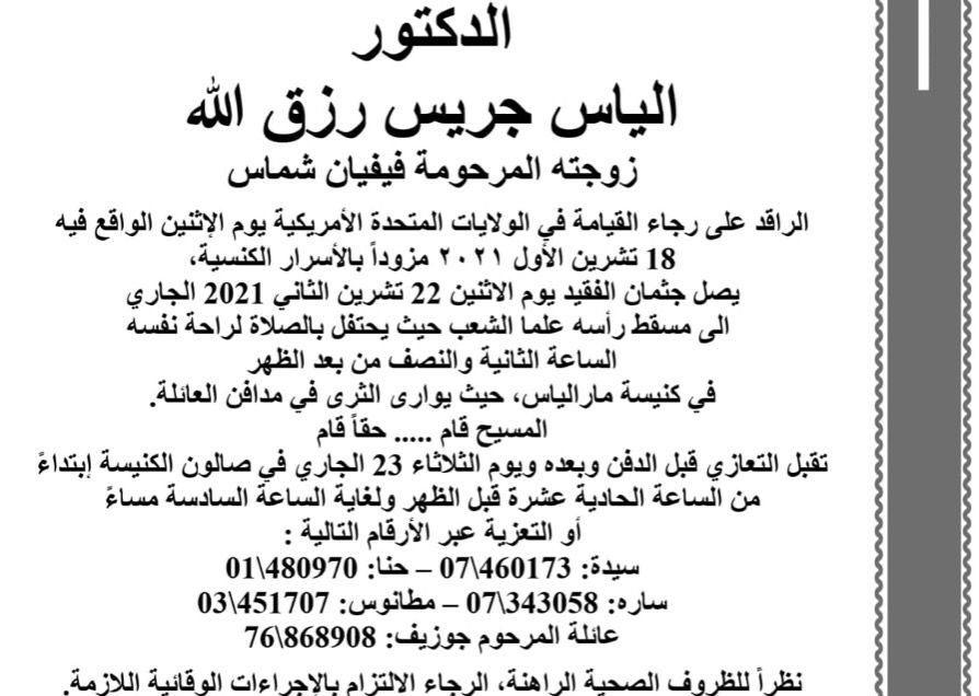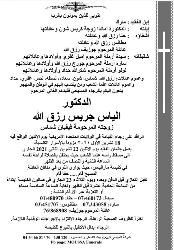 وفاة الدكتور الياس جريس رزق الله