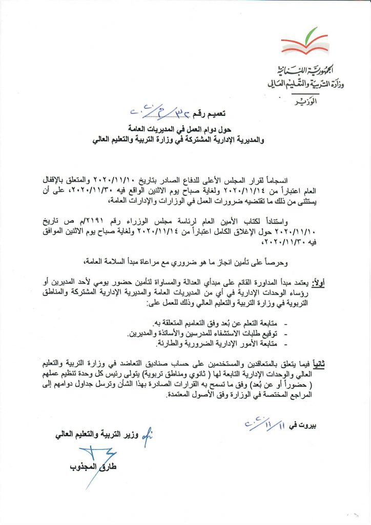 محليات تعميم لوزير التربية عن الدوام في المديريات العامة والمديرية الادارية المشتركة By F.S نوفمبر 11, 2020 لا توجد تعليقات أصدر وزير التربية والتعليم العالي في حكومة تصريف الاعمال الدكتور طارق المجذوب، تعميما حمل الرقم 32/م/ 2020، حول دوام العمل في المديريات العامة والمديرية الادارية المشتركة في وزارةالتربية والتعليم، جاء فيه: