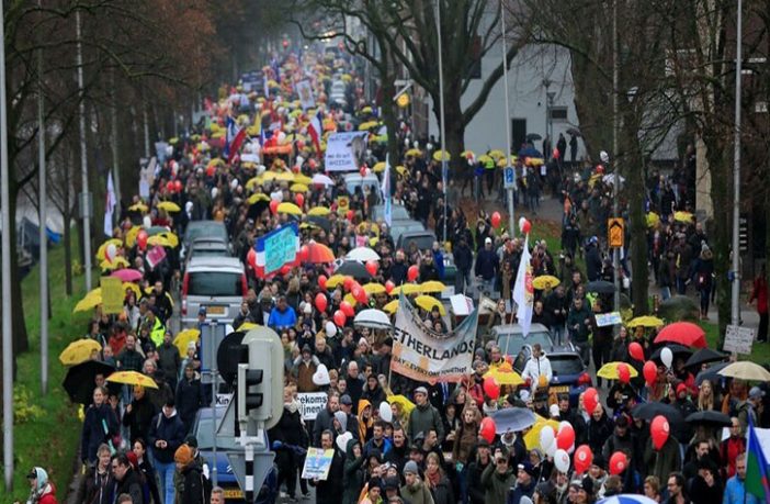 وسار المحتجون في شوارع البلدة رافعين لافتات تقول “الحرية الطبية الآن!” ولوحوا بالعلم الهولندي.