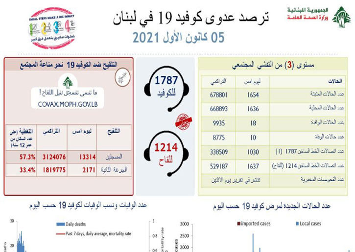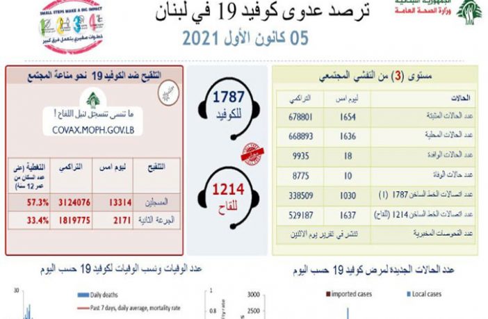أعلنت وزارة الصحة العامة في تقريرها اليومي تسجيل ” 1654 إصابة جديدة بفيروس كورونا رفعت العدد التراكمي للحالات المثبتة الى 678801 ، كما تم تسجيل 10 حالات وفاة”.