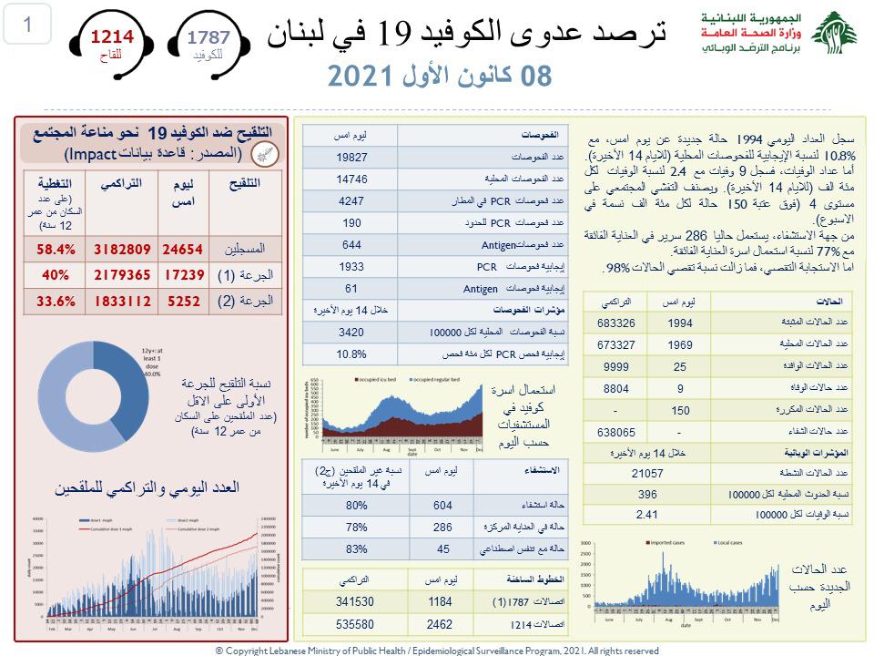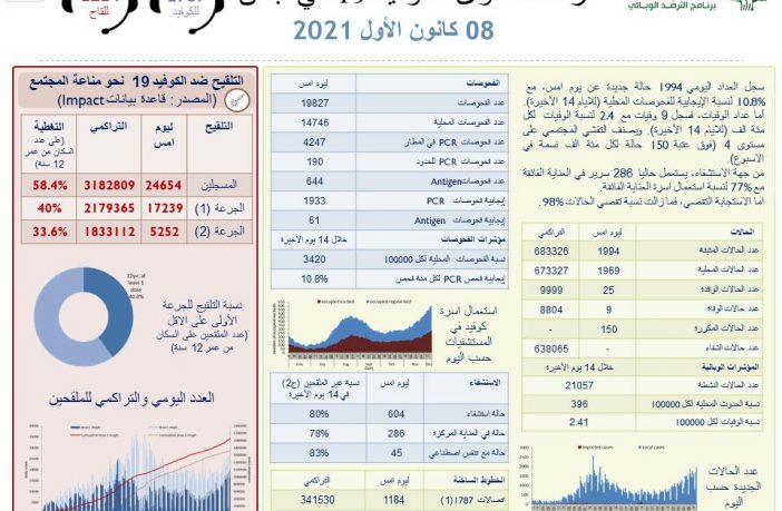 جائحة كورونا وزارة الصحة: تسجيل 1994 إصابة جديدة بفيروس كورونا و 9 حالات وفاة By F.S ديسمبر 8, 2021 لا توجد تعليقات وزارة الصحة: تسجيل 1994 إصابة جديدة بفيروس كورونا و 9 حالات وفاة