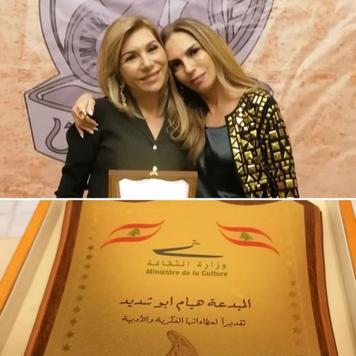 حصدت الممثلة والاعلامية اللبنانية هيام أبو شديد جائزة تكريمية في احتفال نظمته مؤسسة “أرض المبدعين” برعاية وزارة الثقافة.