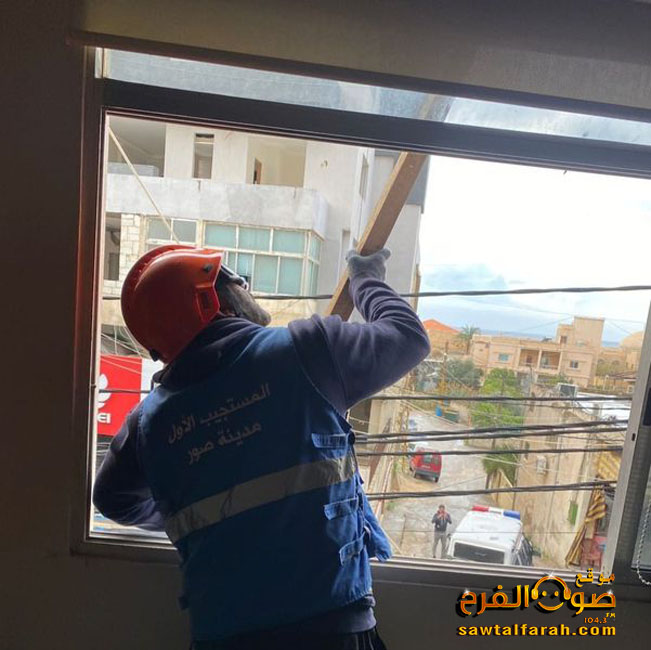 وعلى الفور تحرك فرق المستجيب الاول في جمعية الرسالة للاسعاف الصحي مركز صور وتم الكشف على كافة شرفات المبنى وتم معاينة جميع التصدعات وازالتها وبالتعاون مع وحدة ادارة الكوارث في اتحاد بلديات قضاء صور.