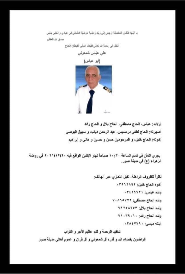 وفيات قبطان صور الحاج علي شمعوني في ذمة الله By F.S ديسمبر 19, 2021 لا توجد تعليقات فقدت مدينة صور اليوم قبطانها الأول الحاج علي شمعوني (أبو عباس).. سيفقدك البحر والبحّارة.. فإلى جنان الخلد.. موقع صوت الفرح يتقدم من ذوي الفقيد بأحر التعازي سائلين المولى عز وجل ان يتغمده بواسع رحمته وان يلهمهم الصبر والسلوان . شمعوني