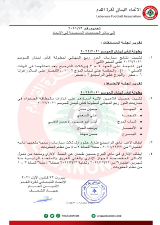 وعلى صعيد متصل، أعلن الاتحاد إيقاف لاعب نادي الراسينج طارق حلوم لمدة 3 مباريات إثر تلقيه بطاقة حمراء أثناء نفس المباراة أيضا.