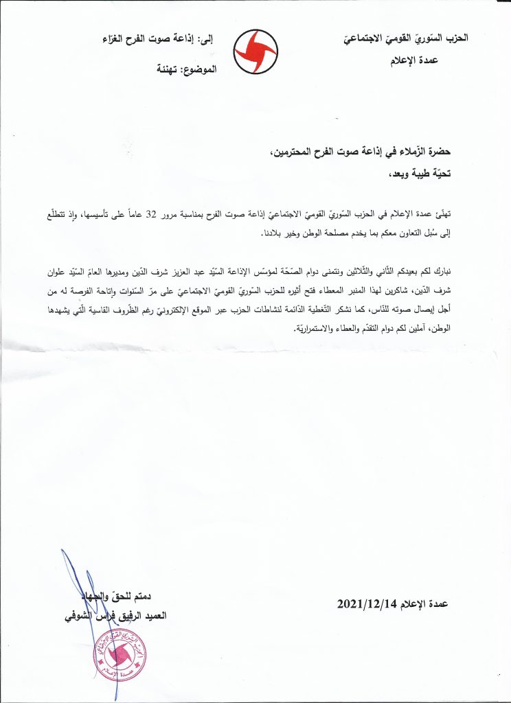 أبرق عميد الإعلام في الحزب السوري القومي الاجتماعي فراس الشوفي مهنئاً إذاعة صوت الفرح بذكرى تأسيسها الثانية والثلاثين، متمنياً دوام الصحة لمؤسسها السيد عبد العزيز شرف الدين ومديرها العام السيد علوان شرف الدين، شاكراً لهذا المنبر المعطاء فتح أثيره للحزب القومي على مر السنوات وإتاحة الفرصة له من أجل إيصال صوته للناس، آملاً للإذاعة دوام التقدم والعطاء والاستمرارية.
