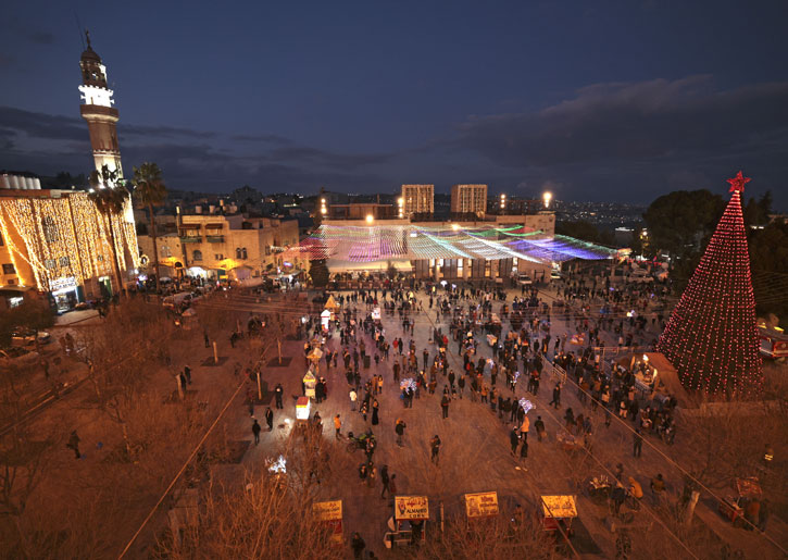 وفي الساحة حيث ترتفع شجرة ميلادية ضخمة، التقط عدد ضئيل من المارة من فلسطينيين وأجانب مقيمين في إسرائيل أو في الضفة الغربية صورا للموكب بواسطة هواتفهم النقالة.