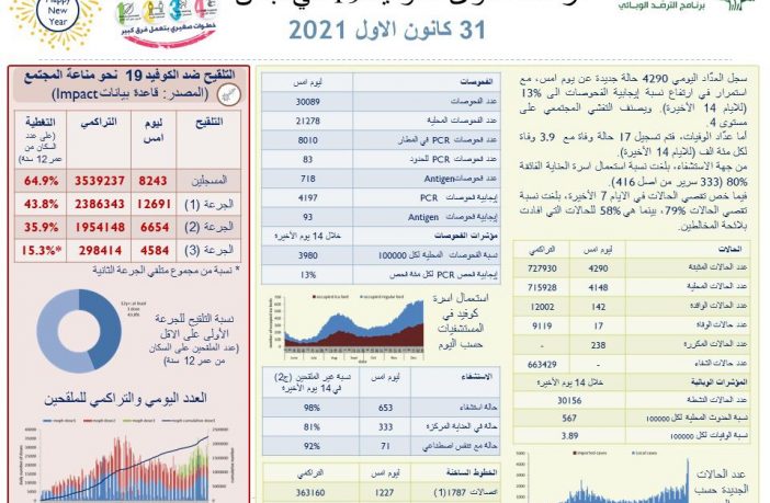 جائحة كورونا تسجيل 4290 إصابة جديدة بفيروس كورونا و 17 حالة وفاة By F.S ديسمبر 31, 2021 لا توجد تعليقات تسجيل 4290 إصابة جديدة بفيروس كورونا و 17 حالة وفاة وزارة الصحة