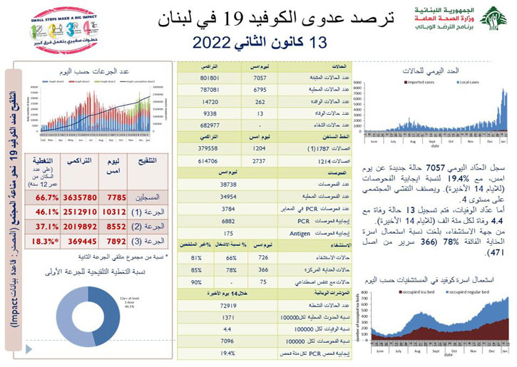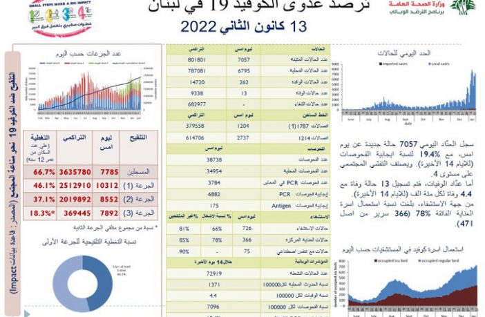 أعلنت وزارة الصحة العامة في تقريرها اليومي تسجيل “7057 إصابة جديدة بفيروس كورونا رفعت العدد التراكمي للحالات المثبتة الى 801801، كما تم تسجيل 13 حالة وفاة”.