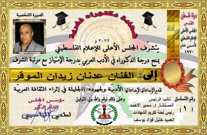 وكان الشاعر والملحن والكاتب ورئيس تجمع فناني صور ،لبنان الاستاذ عدنان زيدان الذي كتب وعبر عن كل ما ذكرناه ،كتب بحب وباصدق المشاعر الانسانية والوطنية والعربية ،فاستحق من المجلس الاعلى للاعلام الفلسطيني هذا الحب وهذا التكريم ومنحه درجة الدكتوراه في الادب العربي بدرجة الامتياز مع مرتبة الشرف ، وفعلا الاستاذ عدنان زيدان الفنان والانسان والعربي الاصيل يستحق هذا ويستحق اكثر من ذلك لانه جدير وقدير و وفي للقضية الفلسطينية ولكل قضايا الحق والعدل والانسانية والاجتماعية والوطنية ….
