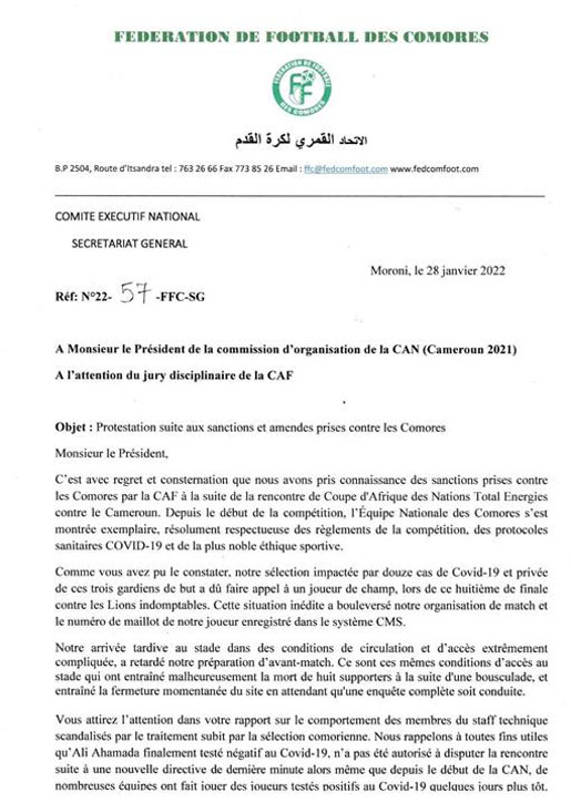 “لقد علمنا مع الأسف بالعقوبات التي اتخذها الاتحاد الإفريقي لكرة القدم ضد جزر القمر، منذ بداية البطولة، كان منتخب جزر القمر نموذجيًا في التعامل مع الجميع، ويحترم بحزم لوائح البطولة، البروتوكولات الصحية لفيروس كورونا وأنبل الأخلاقيات الرياضية، كما رأى الجميع، لقد تأثر منتخبنا بـ 12 حالة مُصابة بفيروس كورونا وحرمان حراس المرمى الثلاثة من المشاركة، كان علينا الاعتماد على لاعب آخر للمشاركة في مباراة الكاميرون في دور الـ 16، كان هذا وضع غير مسبوق ولم نتعرض إليه من قبل تنظيم المباريات لدينا ورقم قميص لاعبنا المسجل في نظام CMS”.