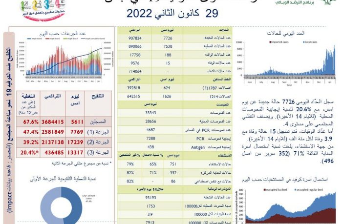 جائحة كورونا وزارة الصحة: تسجيل 7726 إصابة جديدة بفيروس كورونا و 15 حالة وفاة By F.S يناير 29, 2022 لا توجد تعليقات وزارة الصحة: تسجيل 7726 إصابة جديدة بفيروس كورونا و 15 حالة وفاة وزارة الصحة