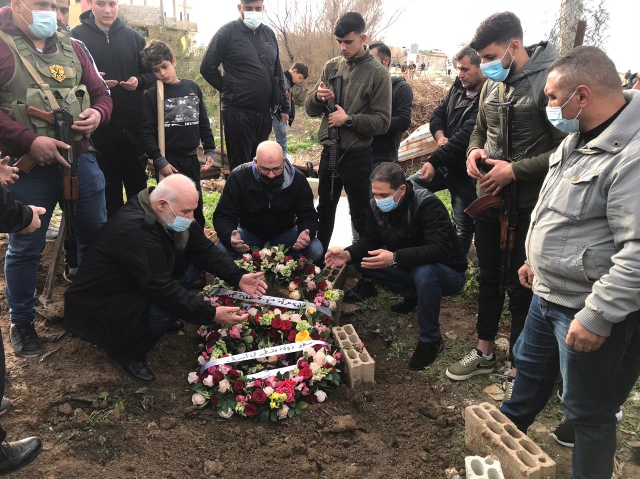 وعلى أكتاف الأهل والمحبين من أبناء شعبنا الفلسطيني حمل الجثمان الطاهر من منزله في المخيم إلى المقبرة، ومن ثم قام رفاق دربه في حركة “فتح” والأمن الوطني الفلسطيني بحمل النعش على الأكف، حيث أدت له ثلة من حرس الشرف في الأمن الوطني التحية العسكرية، قبل مواراته الثرى بمقبرة شهداء المخيم.