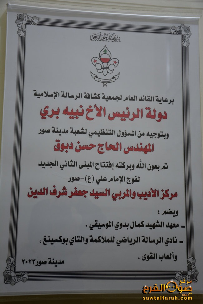 برعاية وحضور رئيس الهيئة التنفيذية لحركة أمل مصطفى الفوعاني، افتتحت جمعية كشافة الرسالة الاسلامية فوج الإمام علي في صور مركز المربي والأديب السيد جعفر شرف الدين .