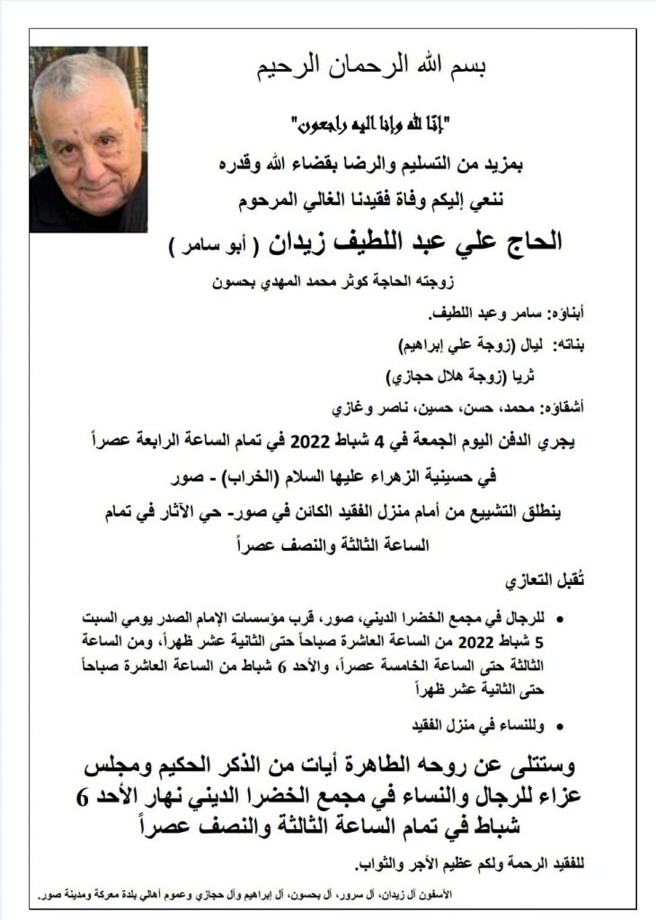 وفاة الحاج علي عبداللطيف زيدان (أبو سامر)