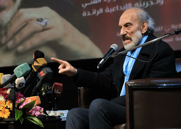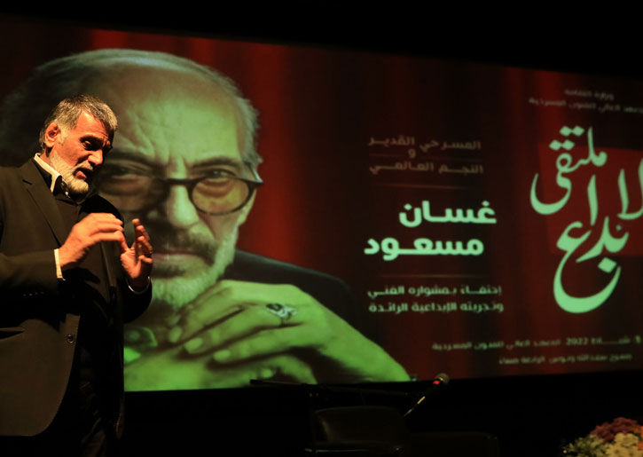 بعينين متوجهتين كجمرتين، أضفت مزيداً من الألق على ملامحه الرصينة، اعتلى الفنان السوري غسان مسعود منصة التكريم على خشبة مسرح سعد الله ونوس بدمشق، فيما تحلق حوله عشرات الطلاب الحالمين الذين حدقوا في أضواء المسرح طويلاً وصاغوا أمنيات كان مسعود أحد أسبابها.