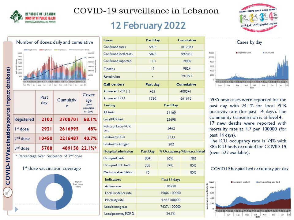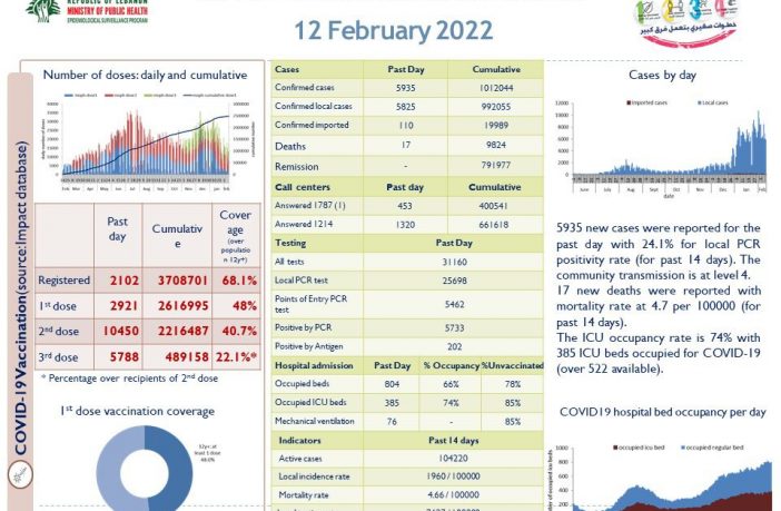 جائحة كورونا وزارة الصحة: 5935 إصابة جديدة بفيروس كورونا و17 حالة وفاة By F.S فبراير 12, 2022 لا توجد تعليقات وزارة الصحة: 5935 إصابة جديدة بفيروس كورونا و17 حالة وفاة وزارة الصحة